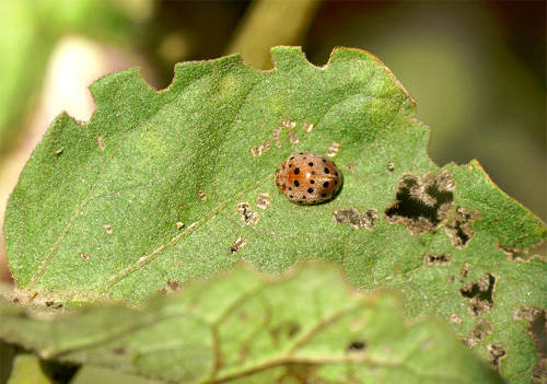 It feeds voraciously on the leaves and tender parts of eggplant. They cause serious damage during their larval stage and when they appear in large numbers. As a result of their feeding, skeletonized patches develop on leaves. Later, the leaves dry away.