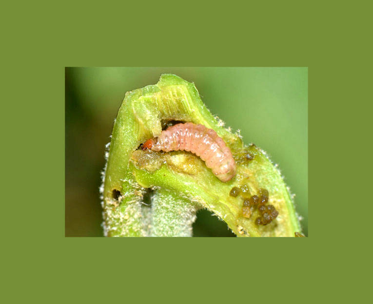 The larva bores inside the terminal shoots, resulting in the withering of the shoots. It also bores into the young fruit and feeds inside which makes the fruit unmarketable